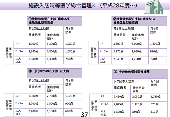 以下は、在宅にかかる「訪問診療」「往診」及び「在宅時医学総合管理料」「施設入居時等医学総合管理料」について中医協の資料を添付いたします。
