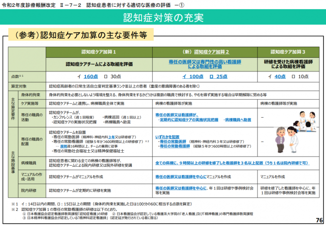 これは①の医師又は認定看護師の配置については、認知症ケア加算1の要件が必要になってきます。認定看護師の要件は厳しいですが、「認知症ケアチーム」の設置や定期的カンファレンスの実施、病棟巡回等の算定要件はなく、定期的な認知症ケアの実施状況の把握と病棟職員への助言でよいものとされています。
