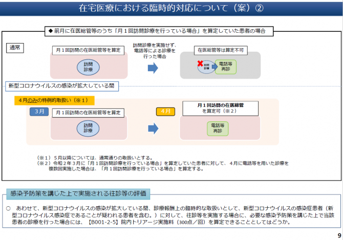 COVID-19感染防止を理由に、施設や患者の家族から、「訪問診療に来ないでほしい」というご要望があり、訪問できず、電話対応のみになっているケースもあるとお聴きしました。これらの対応についても、「時限的・特例的対応」があります。
