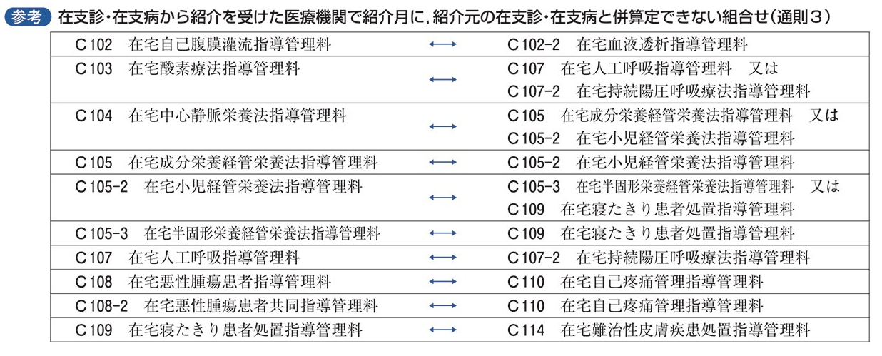 3. 在支診又は在支病から患者の紹介を受けた保険医療機関が,在宅療養支援診療所又は在宅療養支援病院が行う在宅療養指導管理と異なる在宅療養指導管理を行った場合(紹介が行われた月に限る)及び在宅療養後方支援病院が,別に厚生労働大臣の定める患者〔※告示4第4・5の4,p.1235〕に対して当該保険医療機関と連携する他の保険医療機関と異なる在宅療養指導管理を行った場合には,それぞれの保険医療機関において,本款各区分に掲げる在宅療養指導管理料を算定できるものとする。