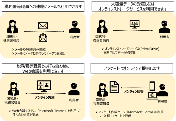 (注)オンラインツールは、利用者の方が税務署等の担当者との間で利用に関する意思の確認を行った場合にのみ利用することとなりますので、それ以外で国税庁をかたった不審なメール等にはご注意ください。